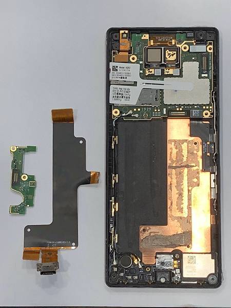 斷電後,我們拆下電池就可以看見充電孔排線。